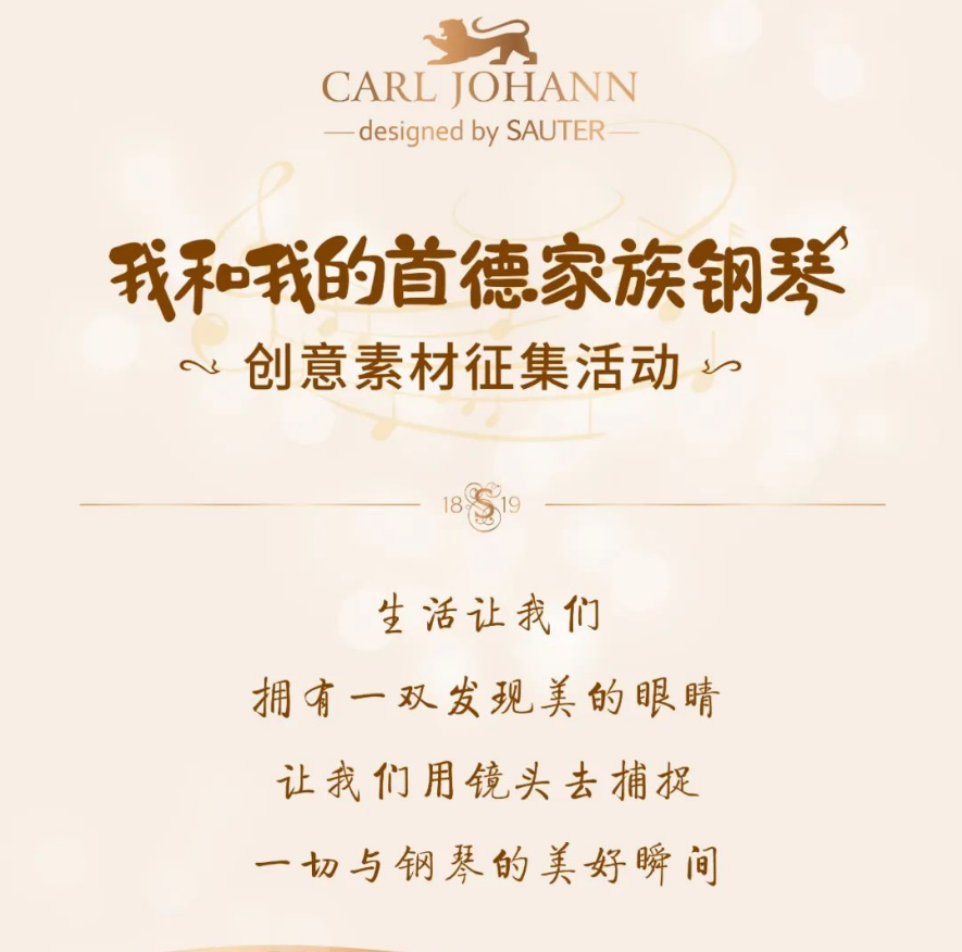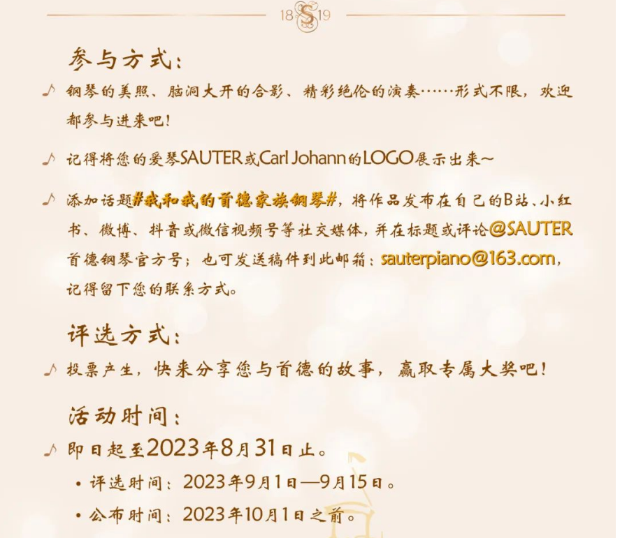 ④添加話題 #我和我的首德家族鋼琴# 發(fā)表在您的個人社媒頻道,并在標題或評論@首德鋼琴官方號;或也可發(fā)送稿件到此郵箱:sauterpiano@163.com,記得留下您的聯(lián)系方式。